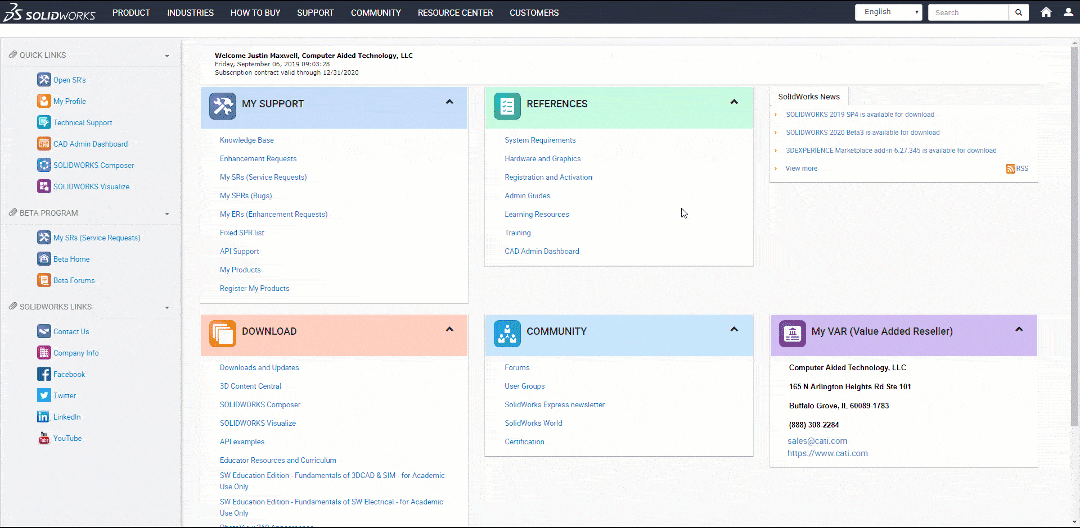 Included with SOLIDWORKS Subscription Services is a Customer Portal account. To access this account and its feature, just visit SOLIDWORKS.com, and click on the login button on the top right. This Customer Portal gives you access to many different things, including Downloads and Updates.