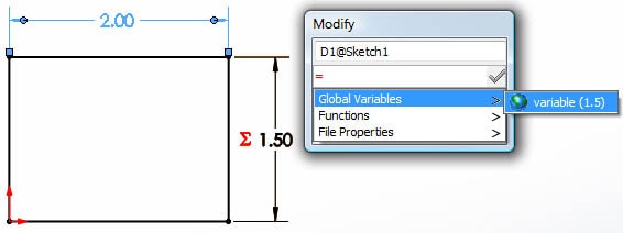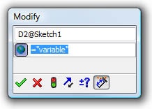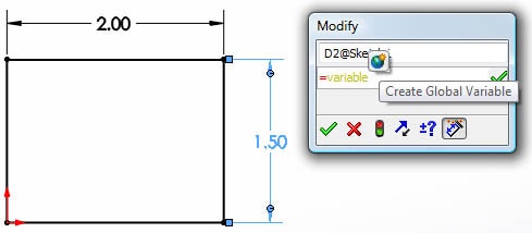 Double click on a sketch dimension to bring up the Modify dialog box. By typing the equal sign you indicate to the system that you will start an equation. After the equal sign you can start to type the name of the global variable. SOLIDWORKS does not recognize this as a global variable until you click the small "Create Global Variable" button that appears as you type. As soon as you click on the button, the global variable is created and allows you to edit its value.