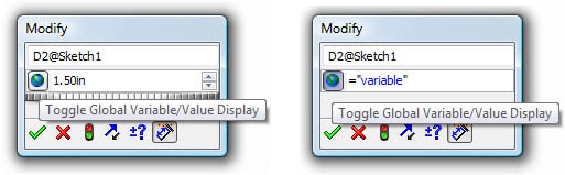 1. Create a global variable Modify dialog box for dimensions. (Note: you can create and display a global variable in the Equations dialog box, but this way is faster.)
