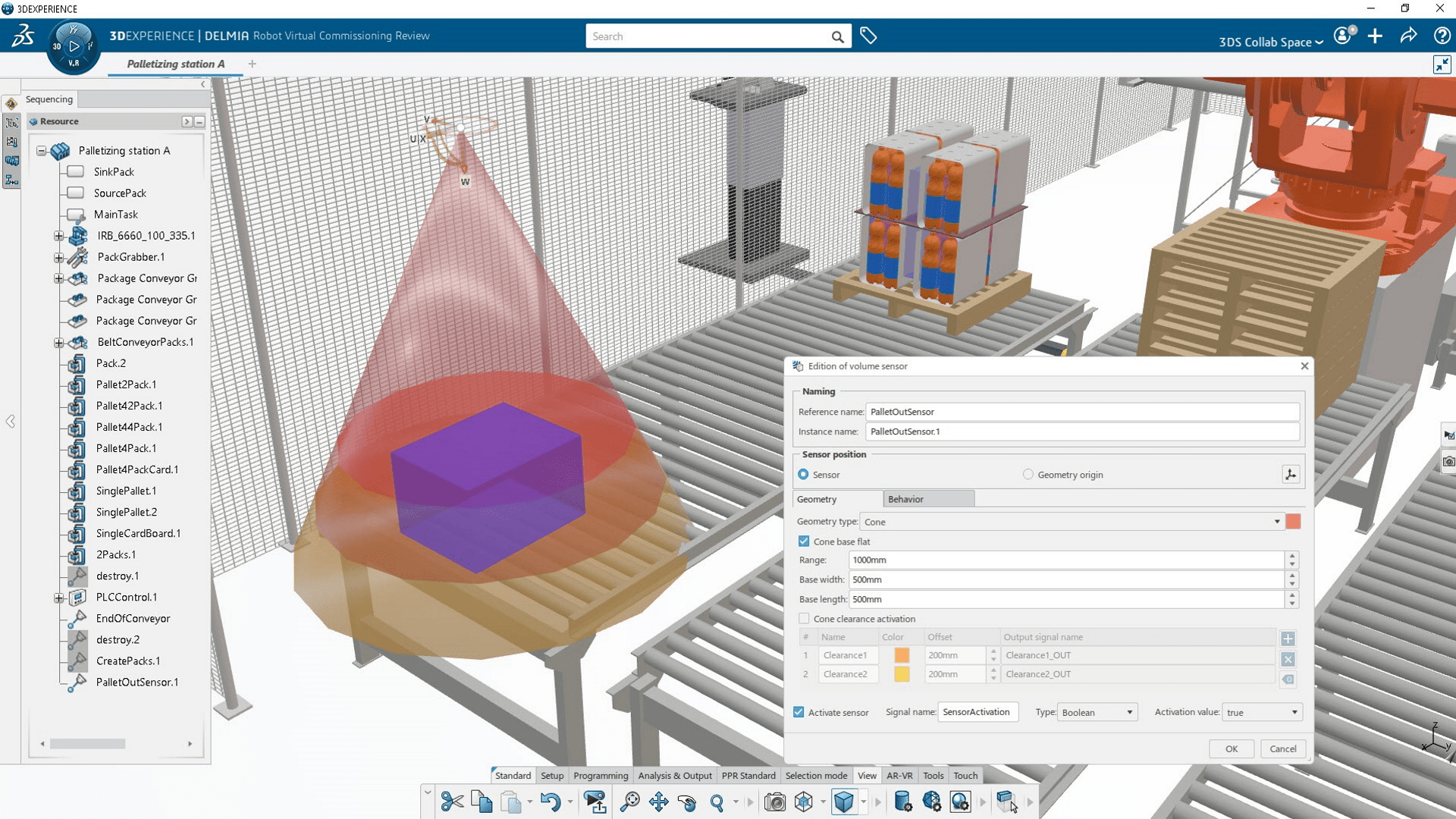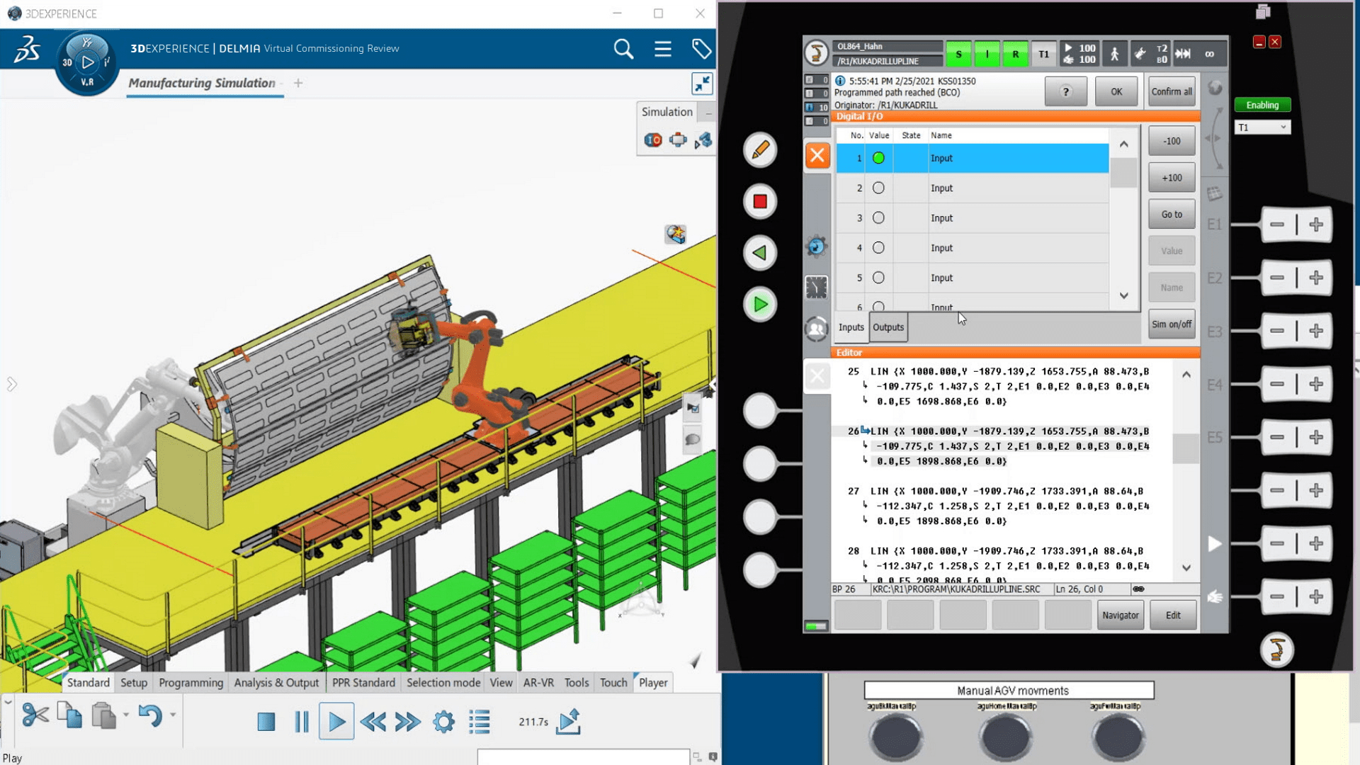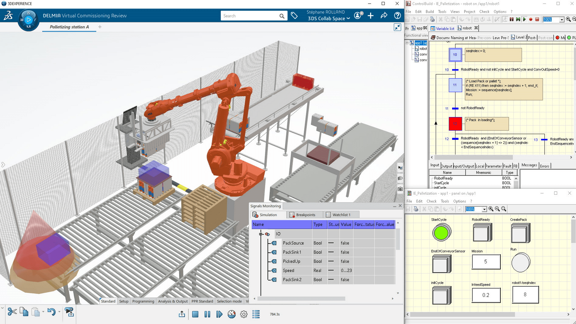 Execute virtual commissioning scenarios on a Manufacturing virtual twin with accurate simulations of Robots, equipment and sensors connected to a PLC program