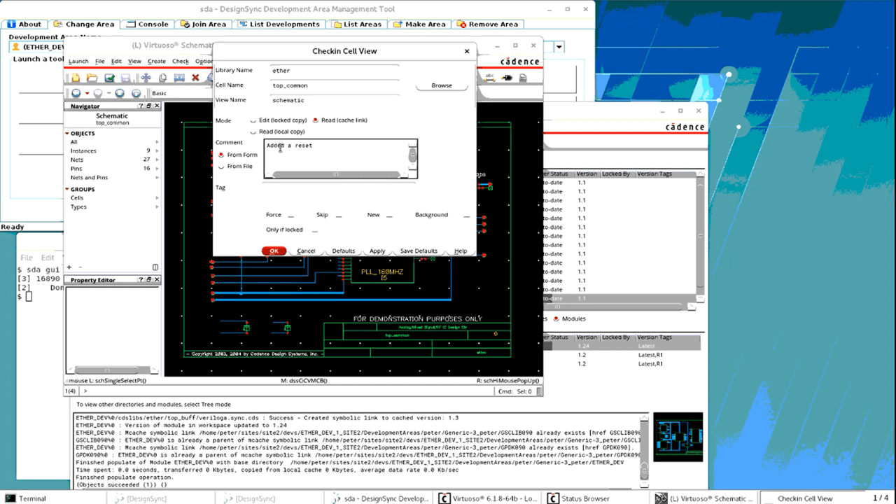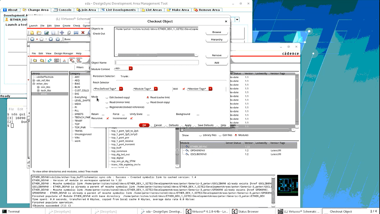 DDM commands such as checkin, checkout, and tag are integrated into the Cadence Virtuoso graphical environment.